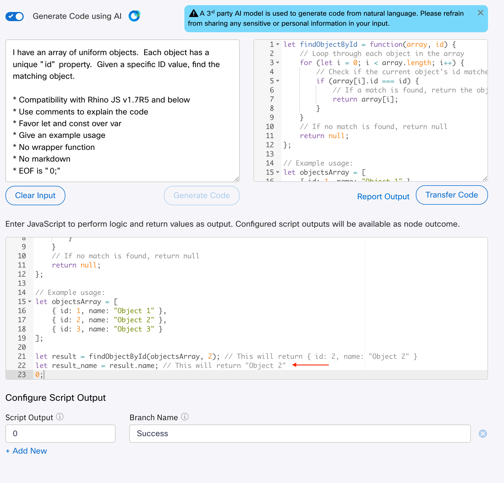 With this in mind, you likely cannot use typical AI code generation tools, even the built-in one inside of Webex Connect, as-is. You might have success with the bare results, but you also might need to massage the output, or use prompt engineering to get working results. I touch on this later in the article.