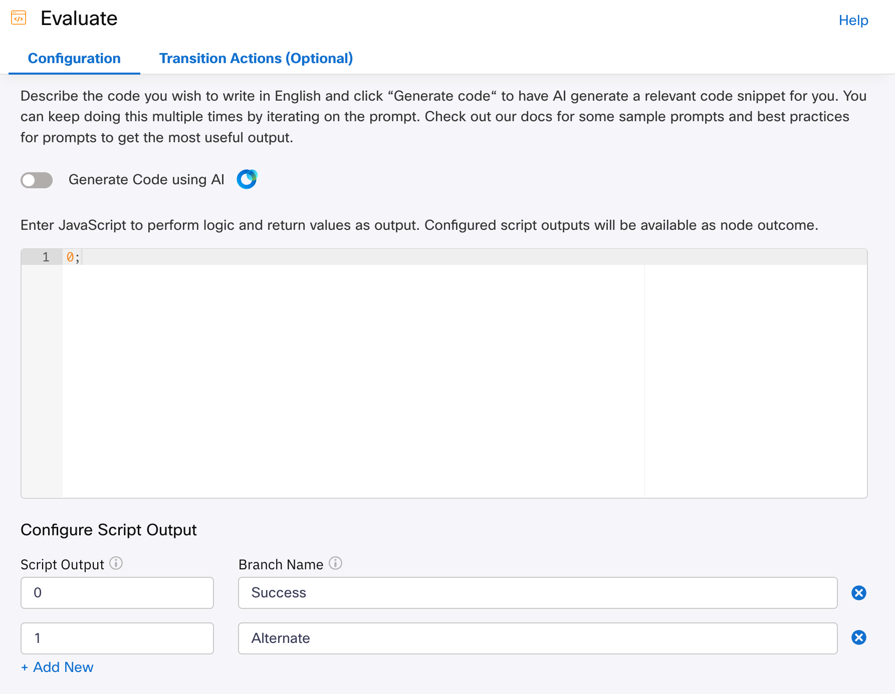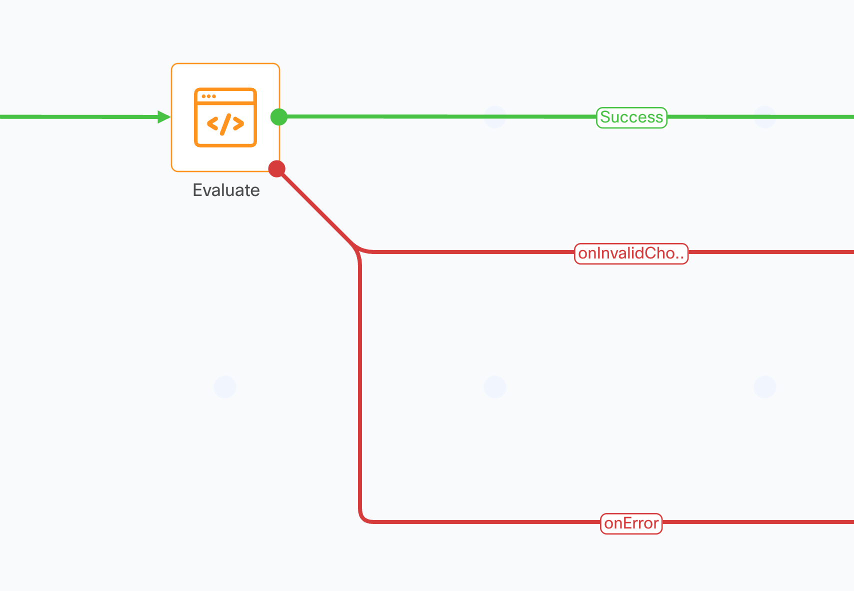 Note: You cannot connect two success branches to the same next node, they must connect to unique nodes. This is not specific to Evaluate node, and is a Webex Connect general behavior.