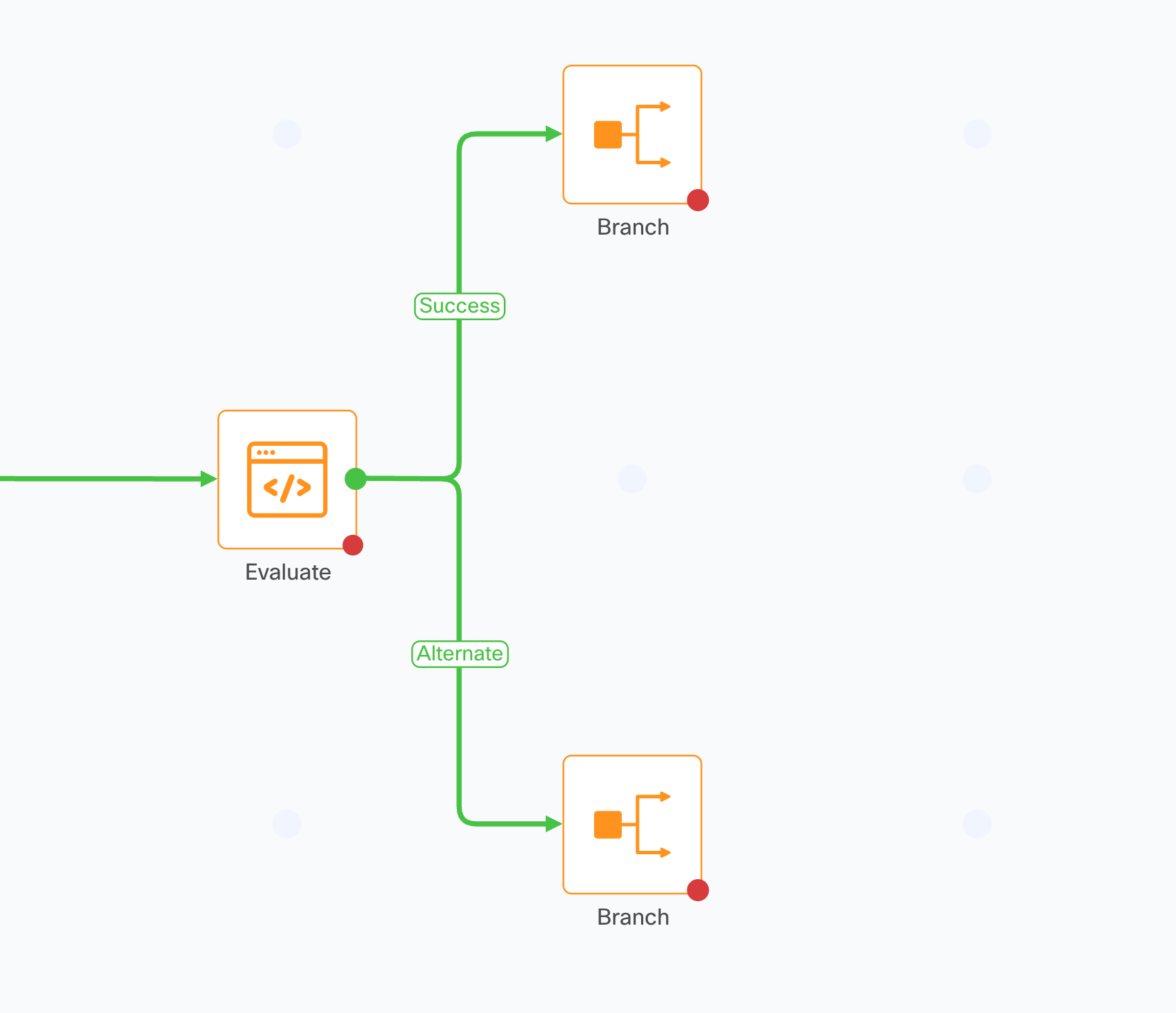 The Evaluate node has a built in branching mechanism, such that you do not need to connect the success output(s) of the Evaluate node to the input of a Branch node.