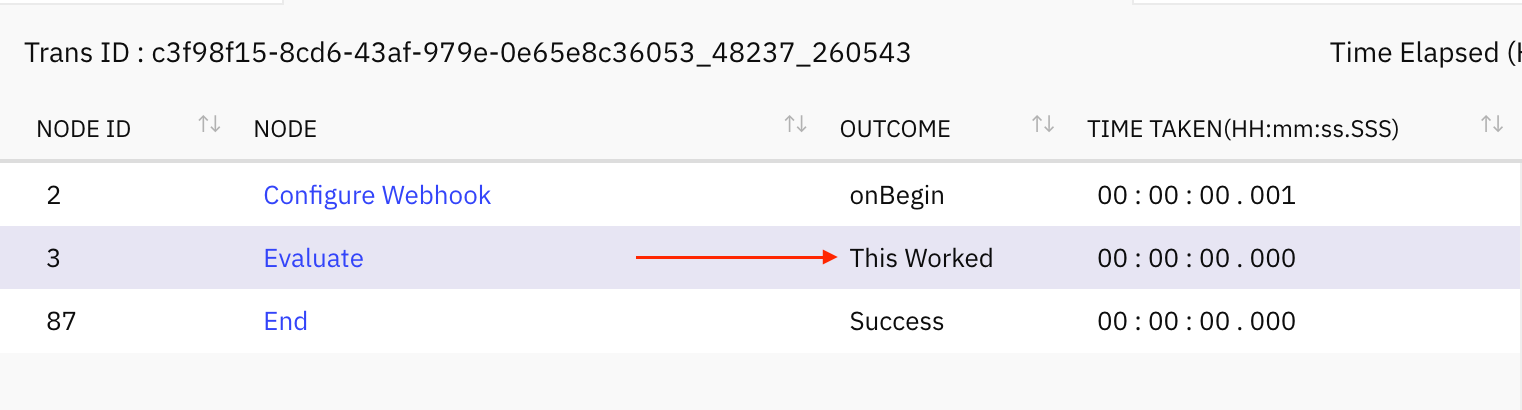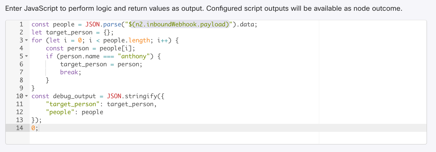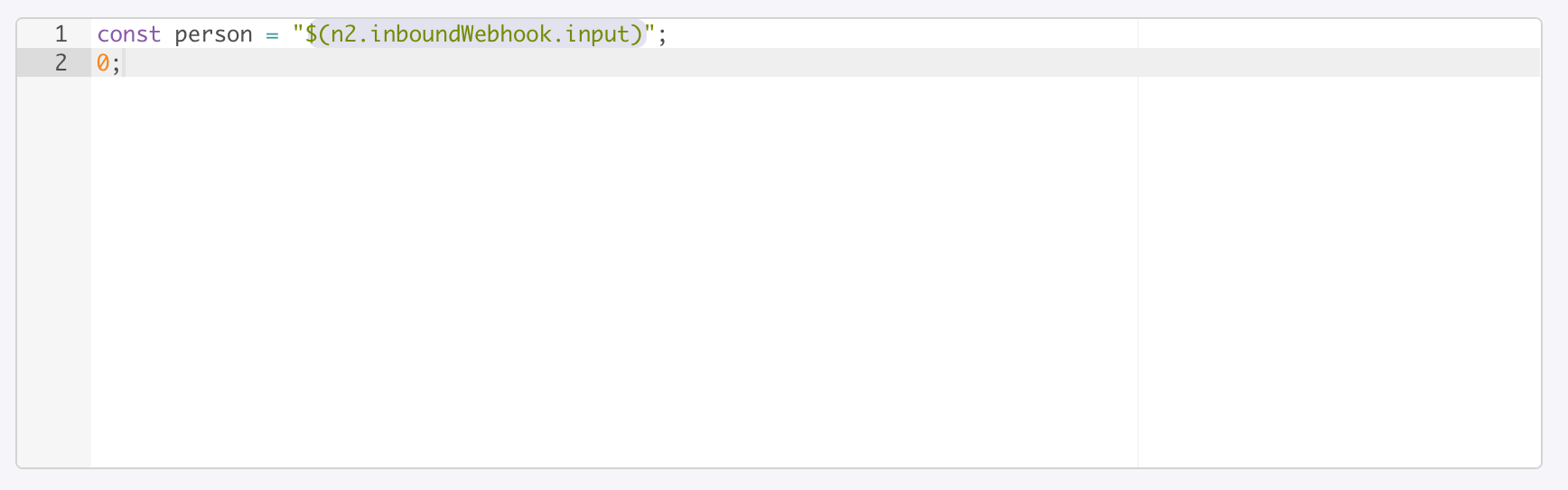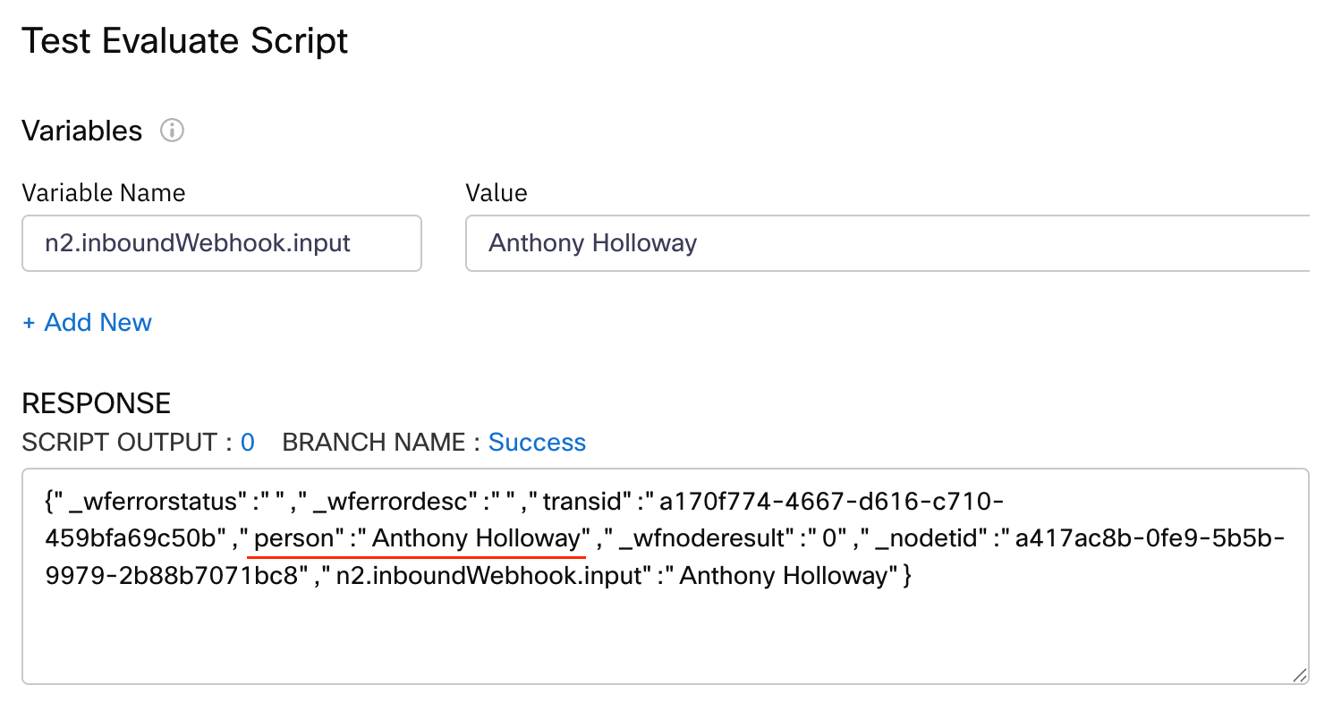 By default, and as you might imagine, you can use another node’s output variables, just like you do in most other nodes (e.g., $(variable)). In the below example, my inbound webhook is looking for a JSON payload with a key named “input” in it, and my Evaluate node can reference it as follows:
