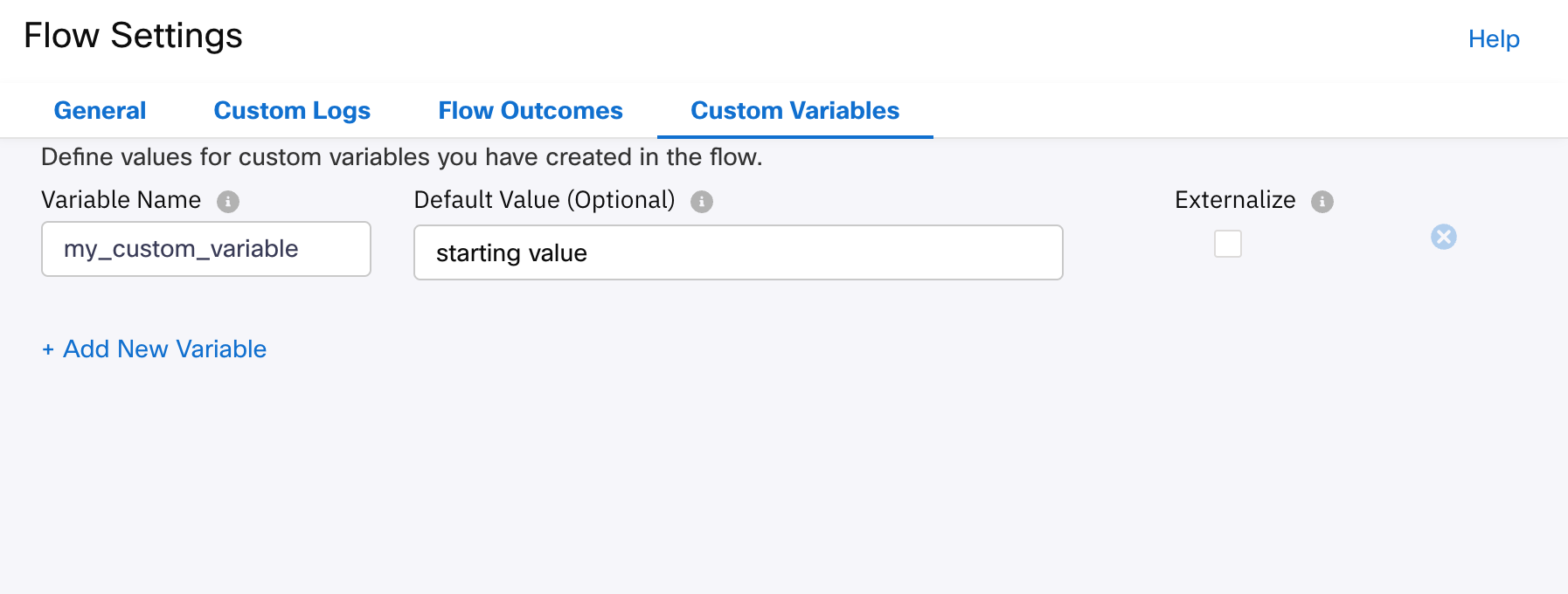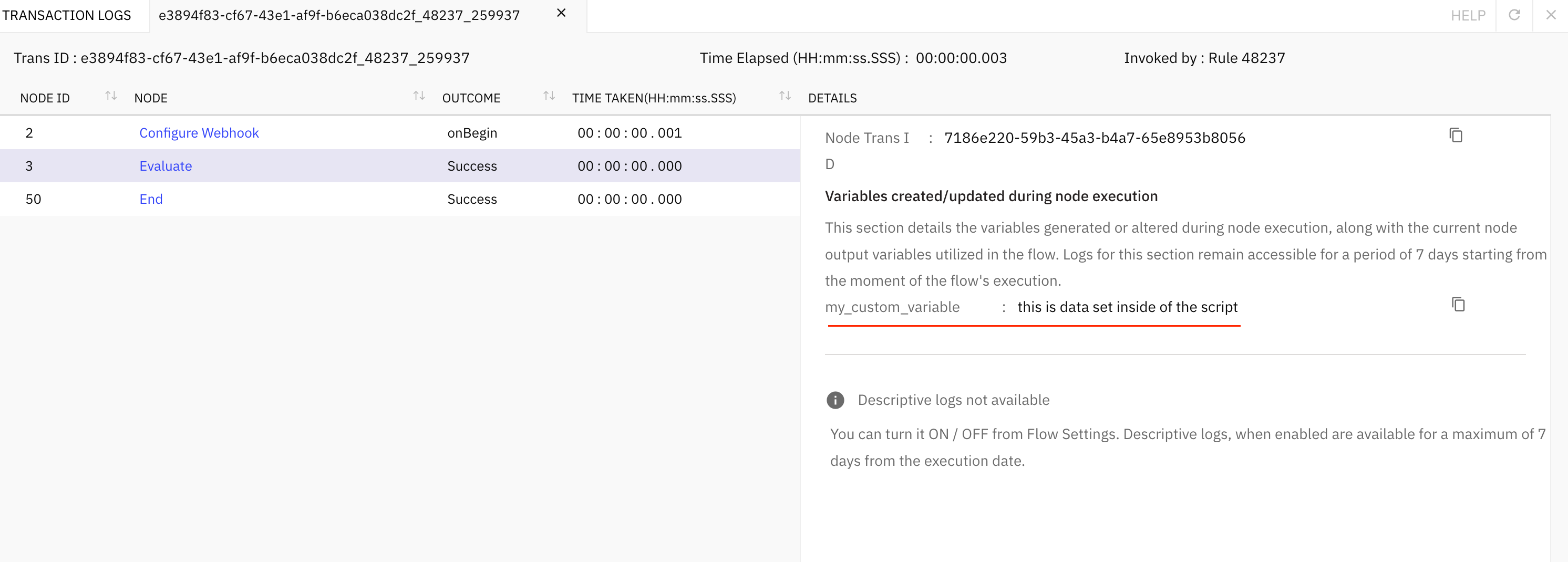 In this example, I wanted to work with the transaction ID for the flow execution, so at the start node, I set my custom variable transaction_id upon leave.