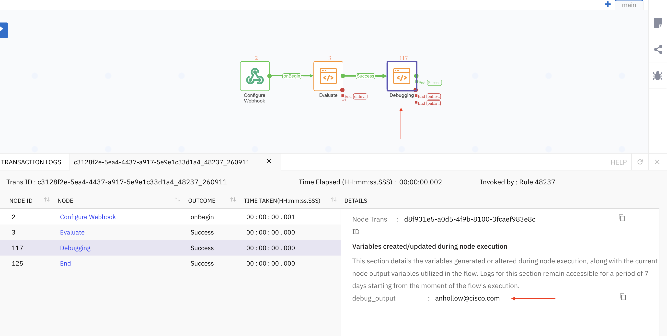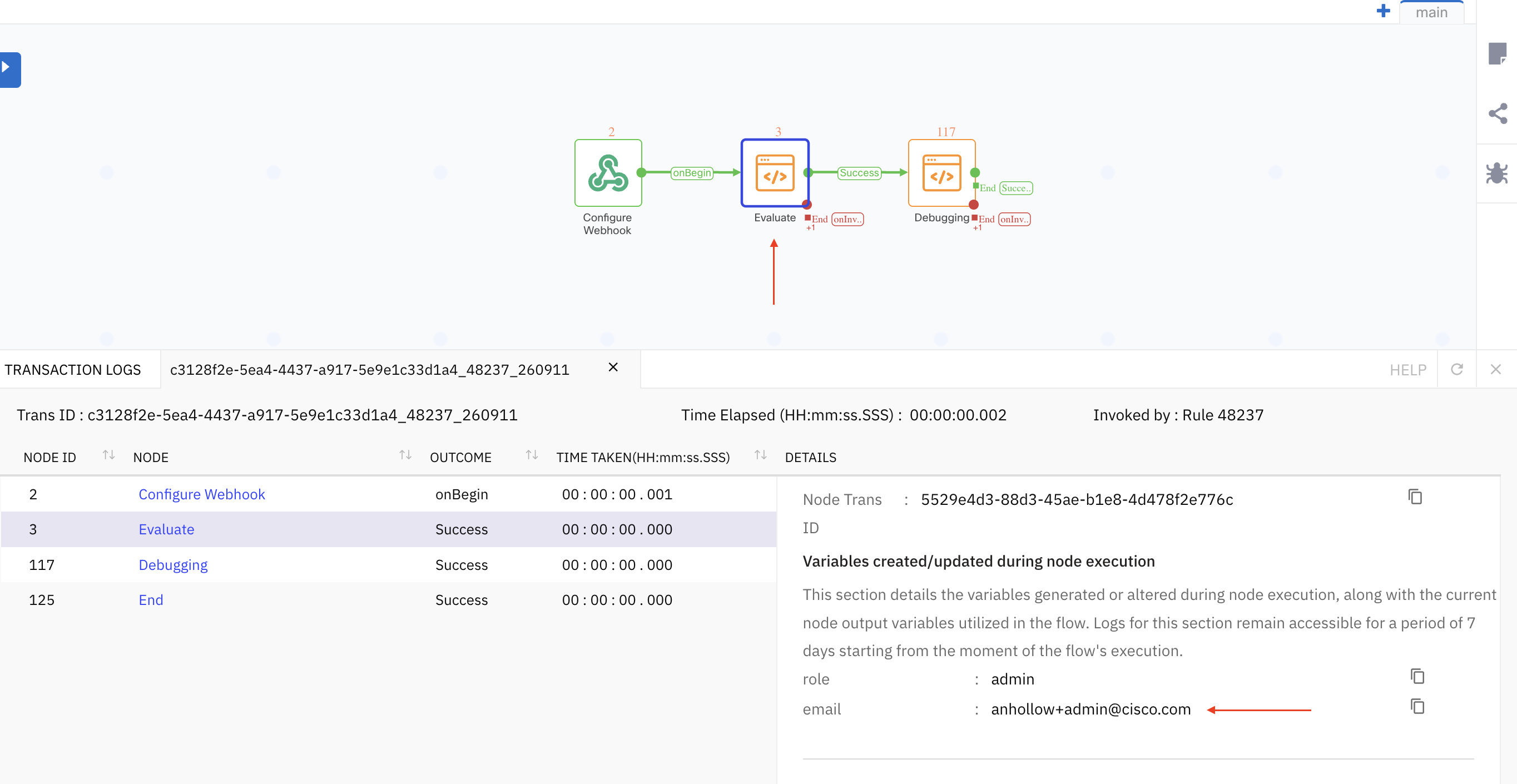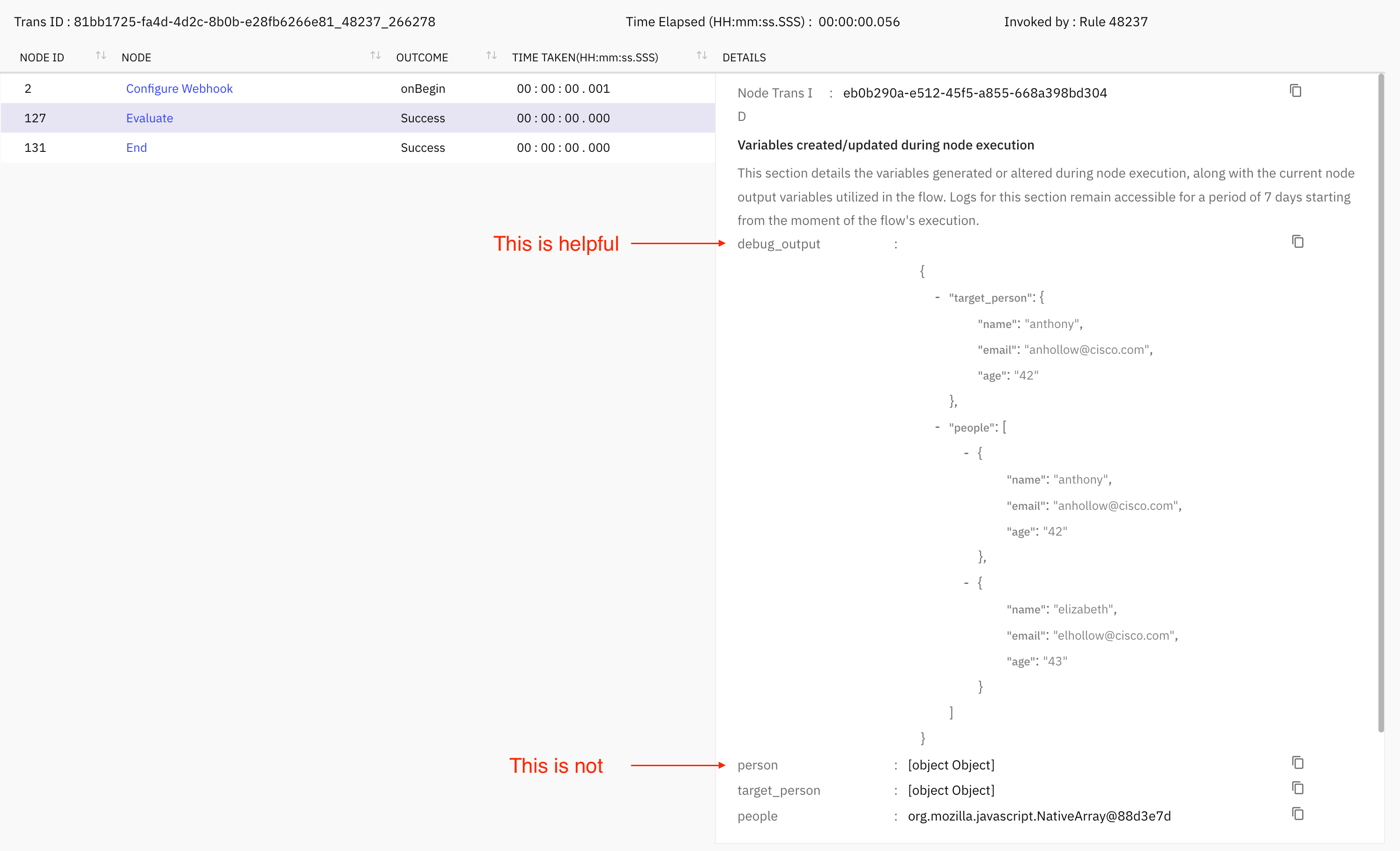 But it’s not always that way. If my inbound webhook has defined that I will receive an email address as JSON input, then Webex Connect will make the variable email available to our Evaluate node, but in a way which clashes with our scope.