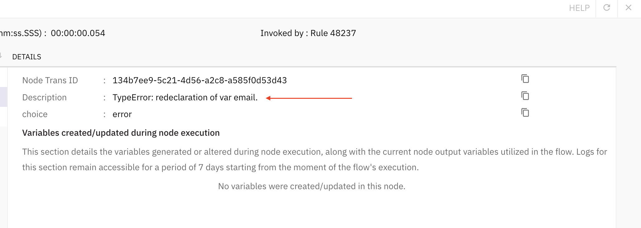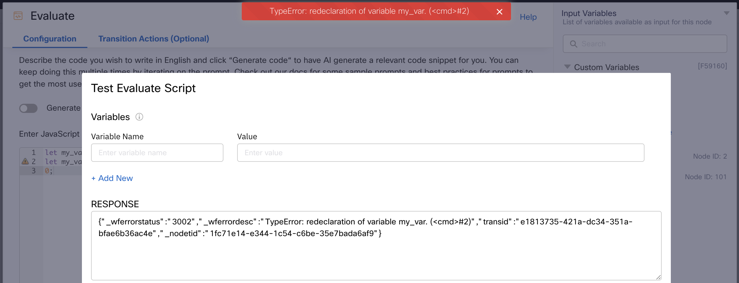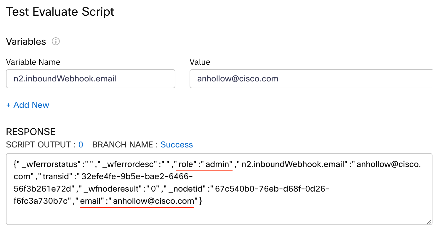 But it’s not always that way. If my inbound webhook has defined that I will receive an email address as JSON input, then Webex Connect will make the variable email available to our Evaluate node, but in a way which clashes with our scope.