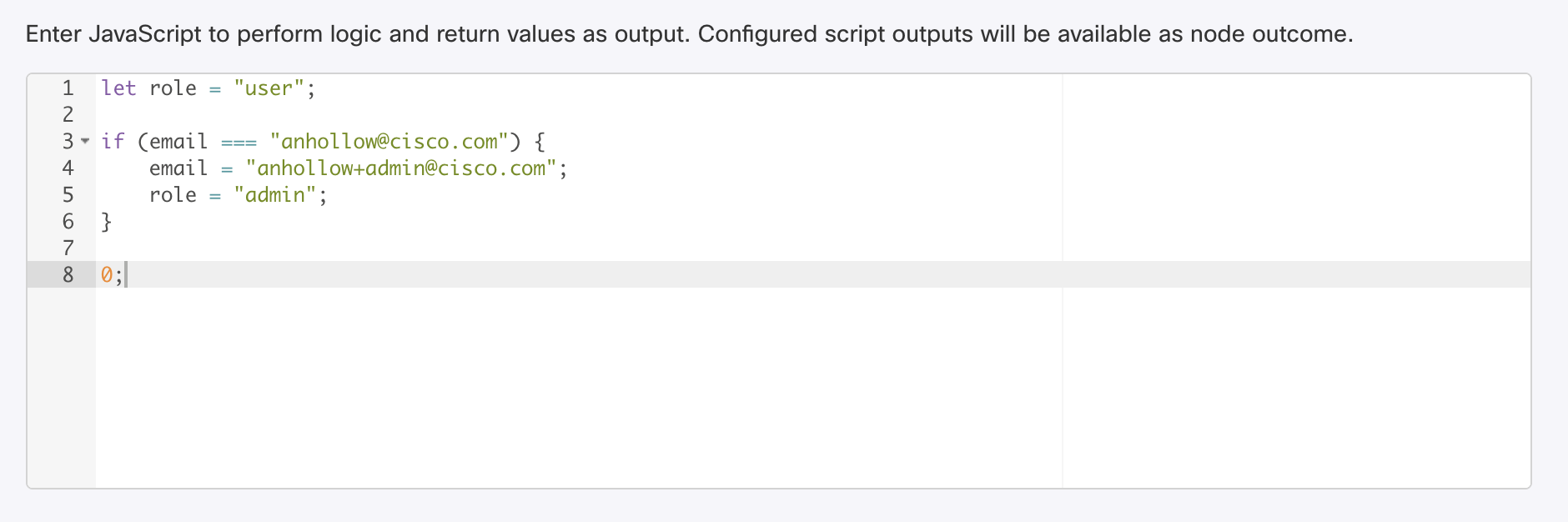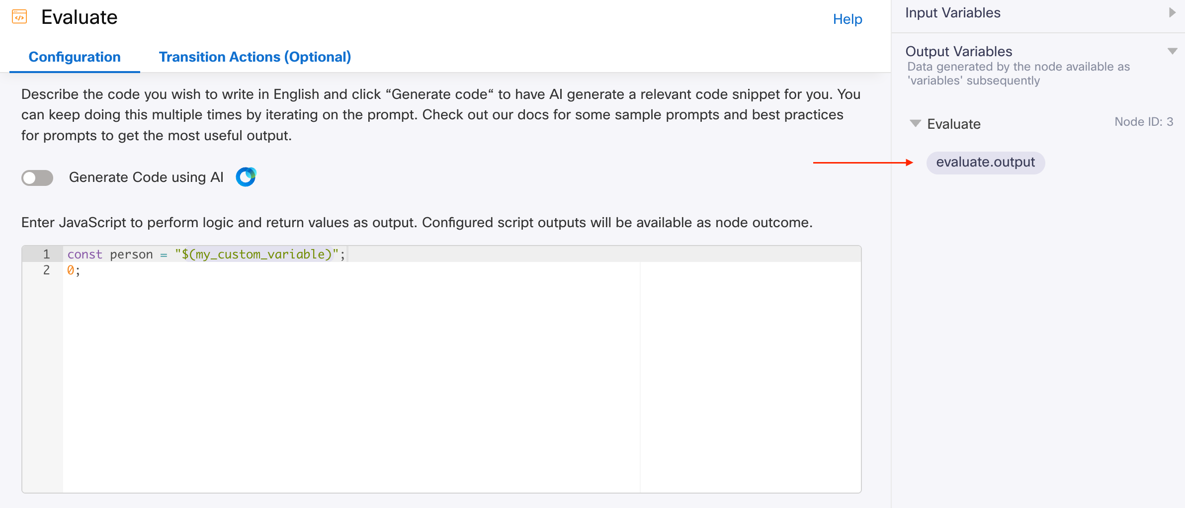 While similar to Functions in WxCC Flow Designer, the Evaluate node runs on the Rhino JS Engine, and therefore, is not compatible with more common Javascript programming features and concepts.